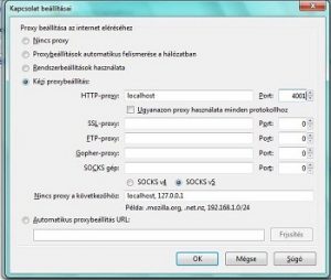 Eszközök-beállítások, hálózat proxy beállítások menüpontban a proxy kapcsolathoz a localhost, a port száma pedig 4001 legyen.